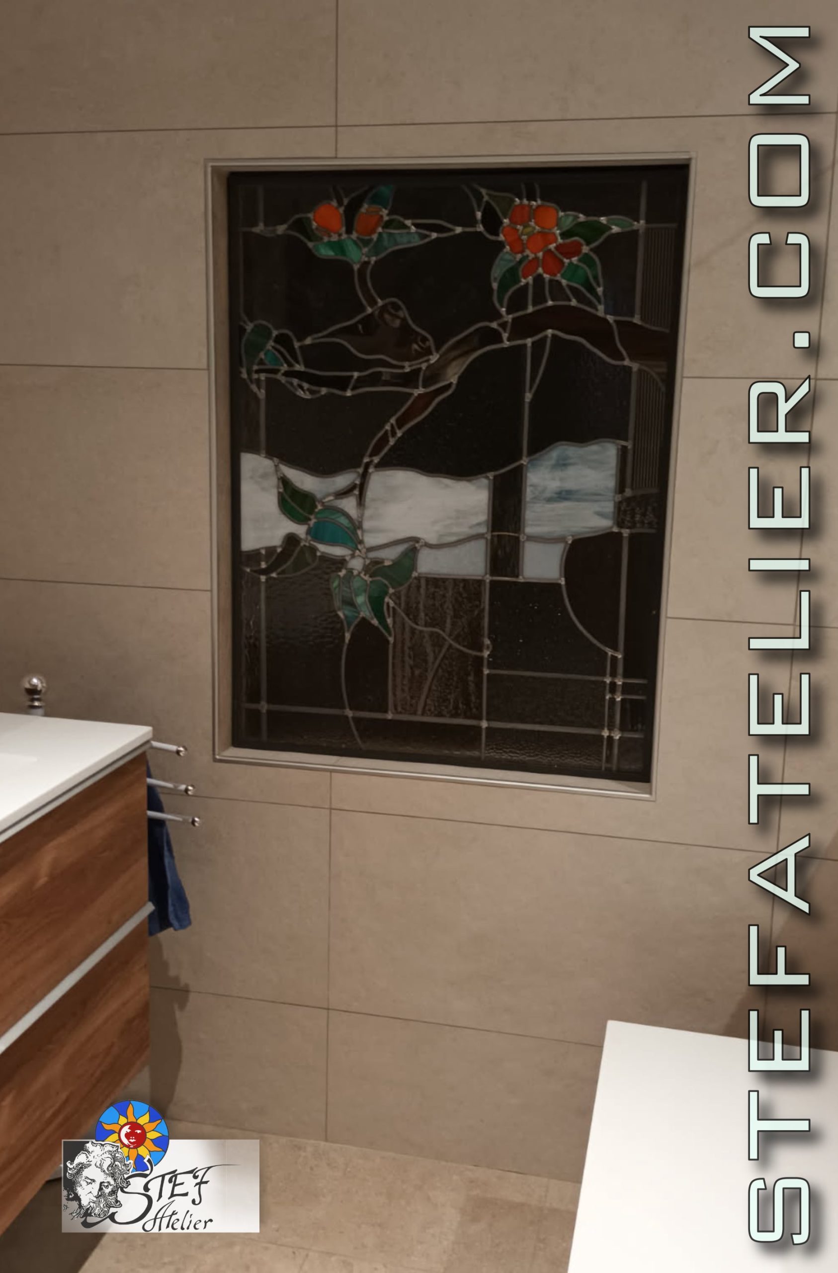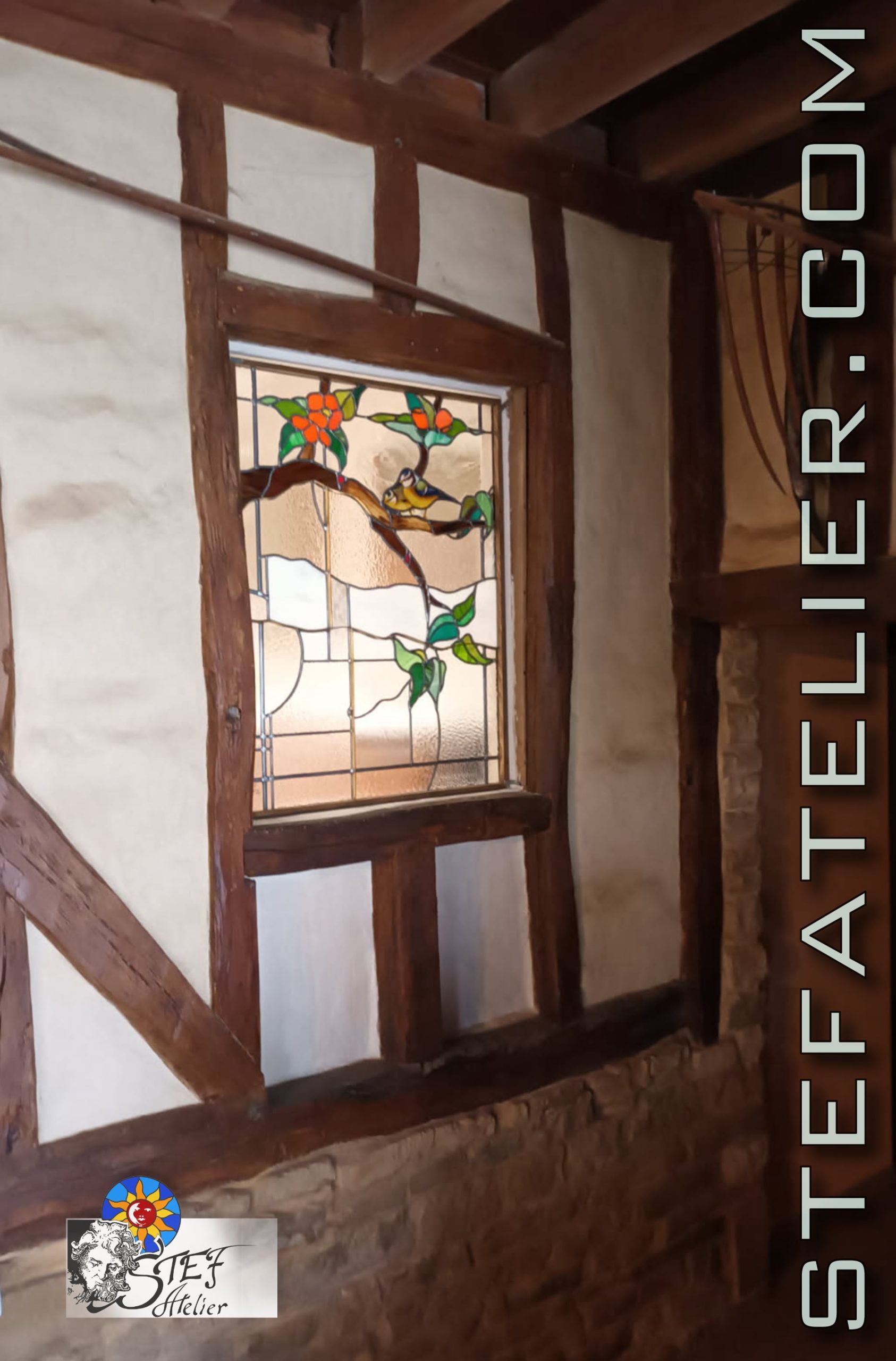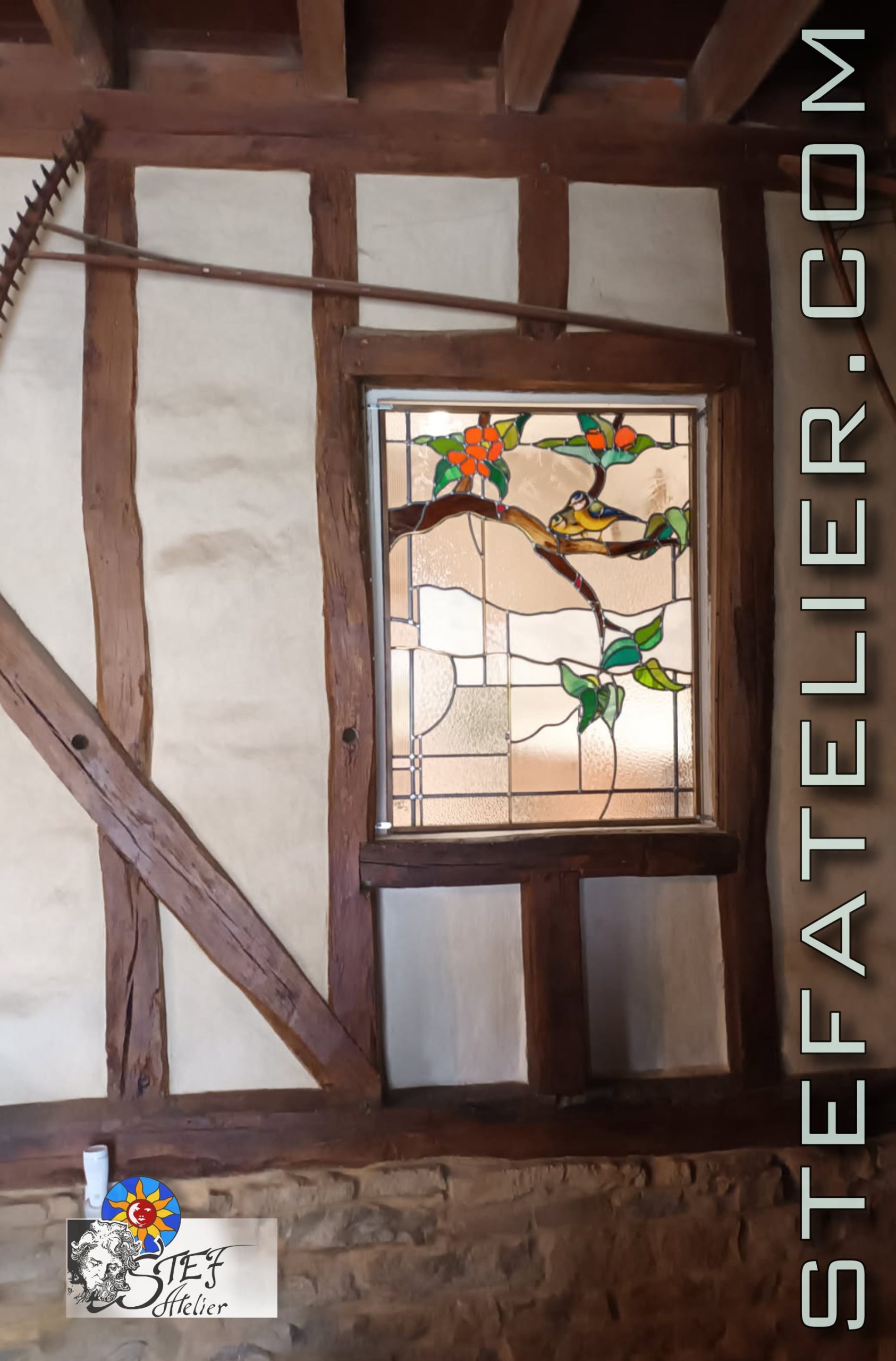 Création d’un vitrail au motif de mésange, installé entre le salon et la salle de bain. Cette séparation décorative permet de diffuser la lumière tout en préservant l’intimité.