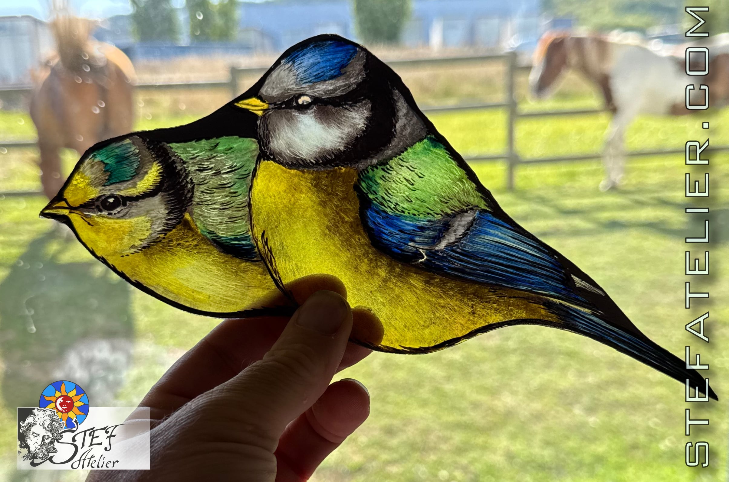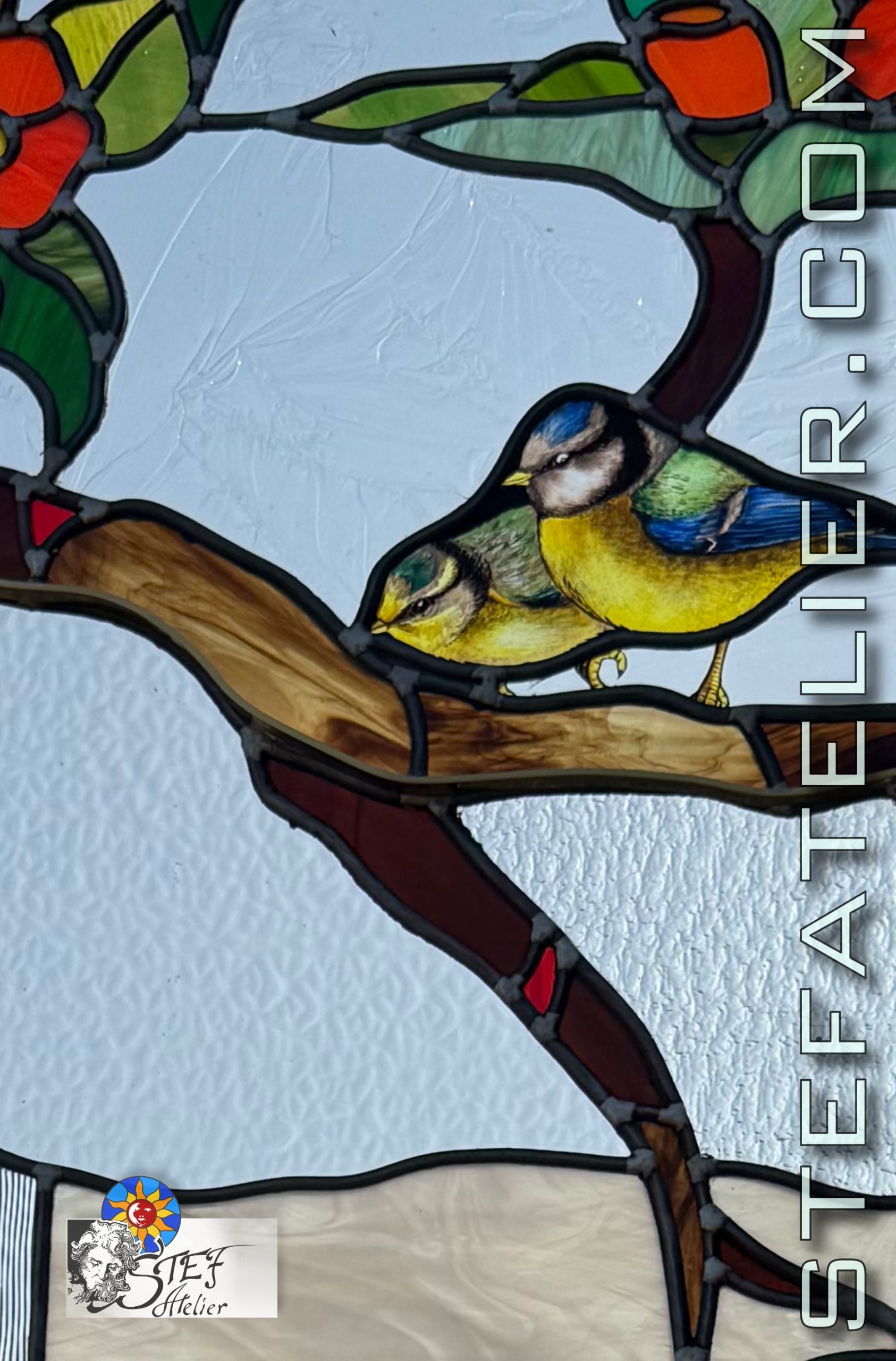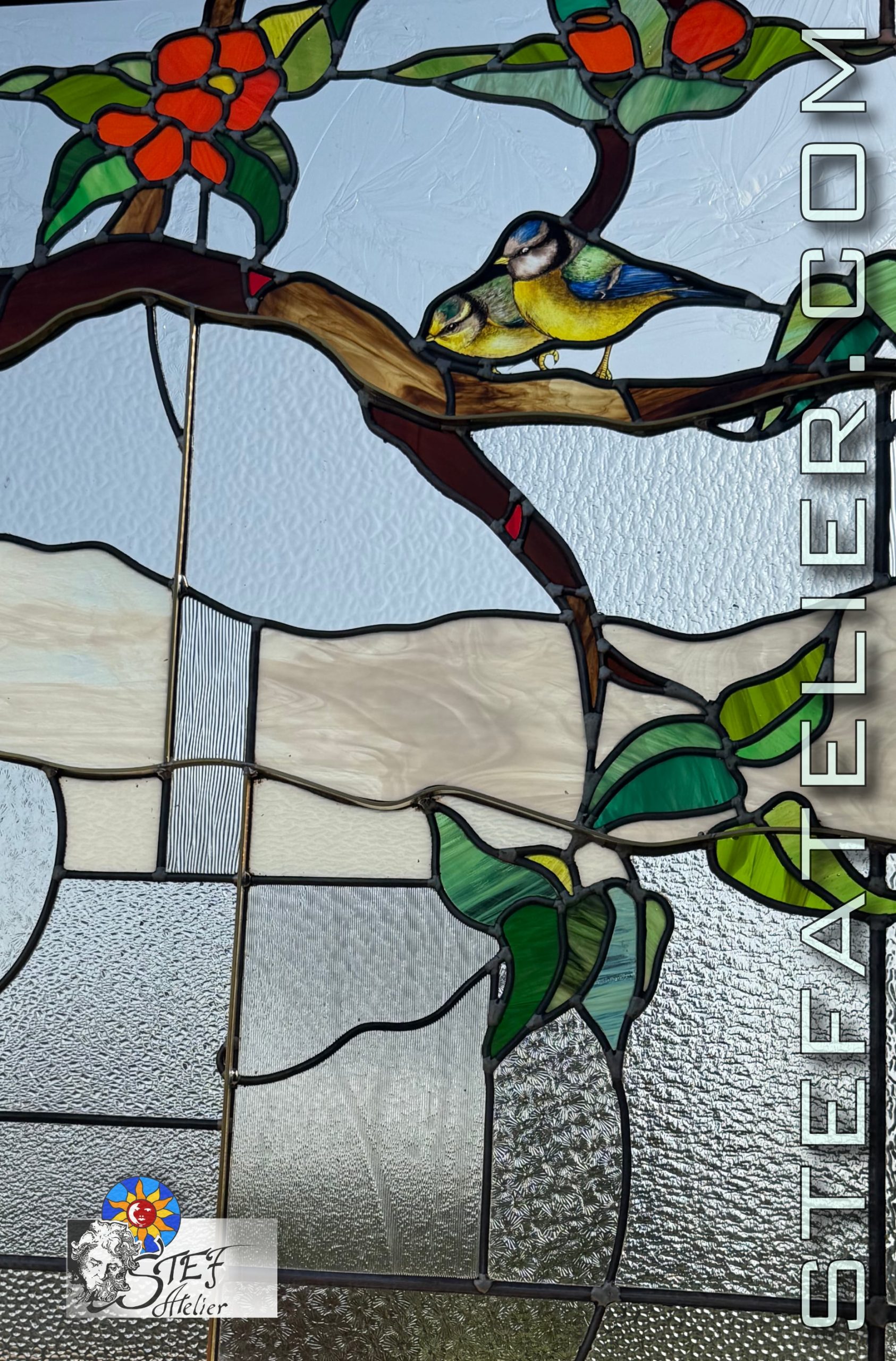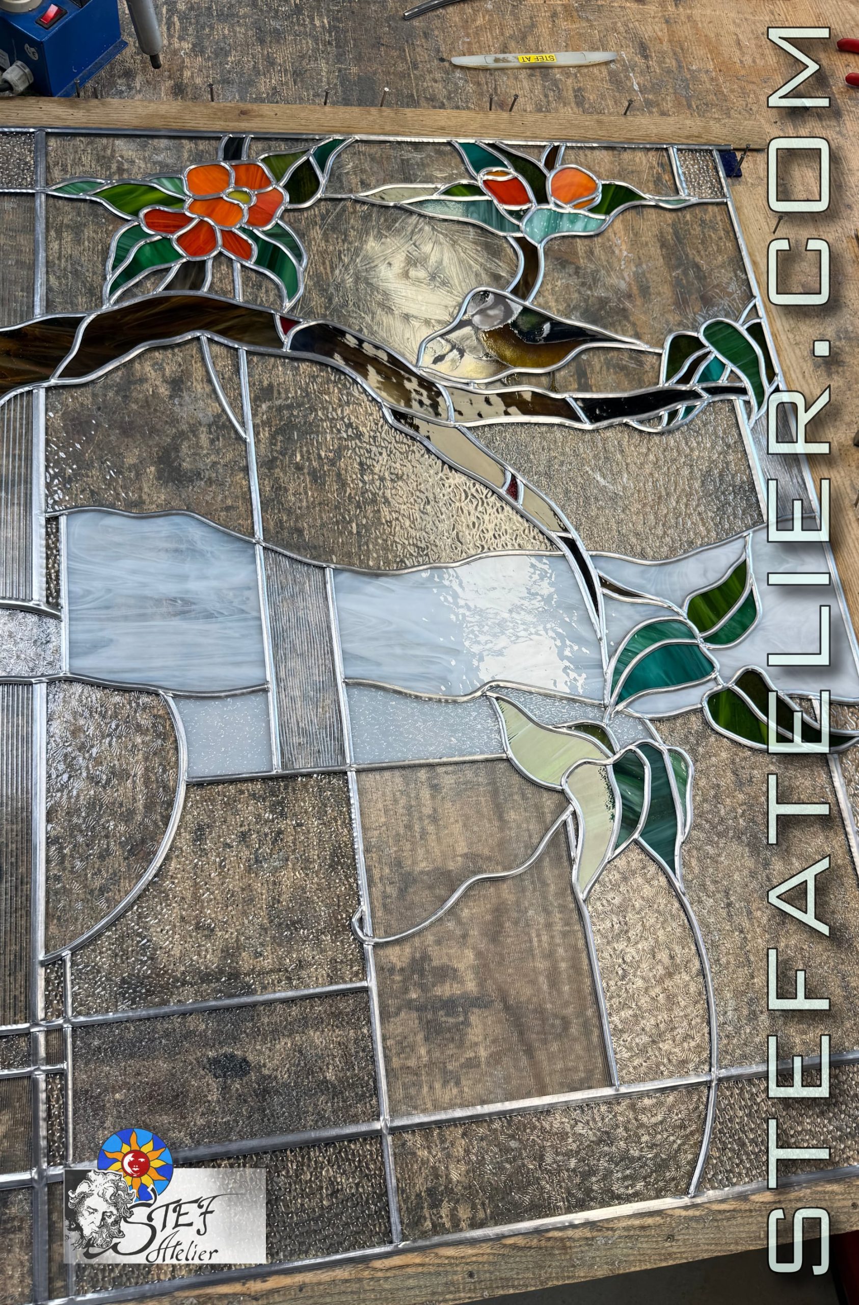 Création d’un vitrail au motif de mésange, installé entre le salon et la salle de bain. Cette séparation décorative permet de diffuser la lumière tout en préservant l’intimité.